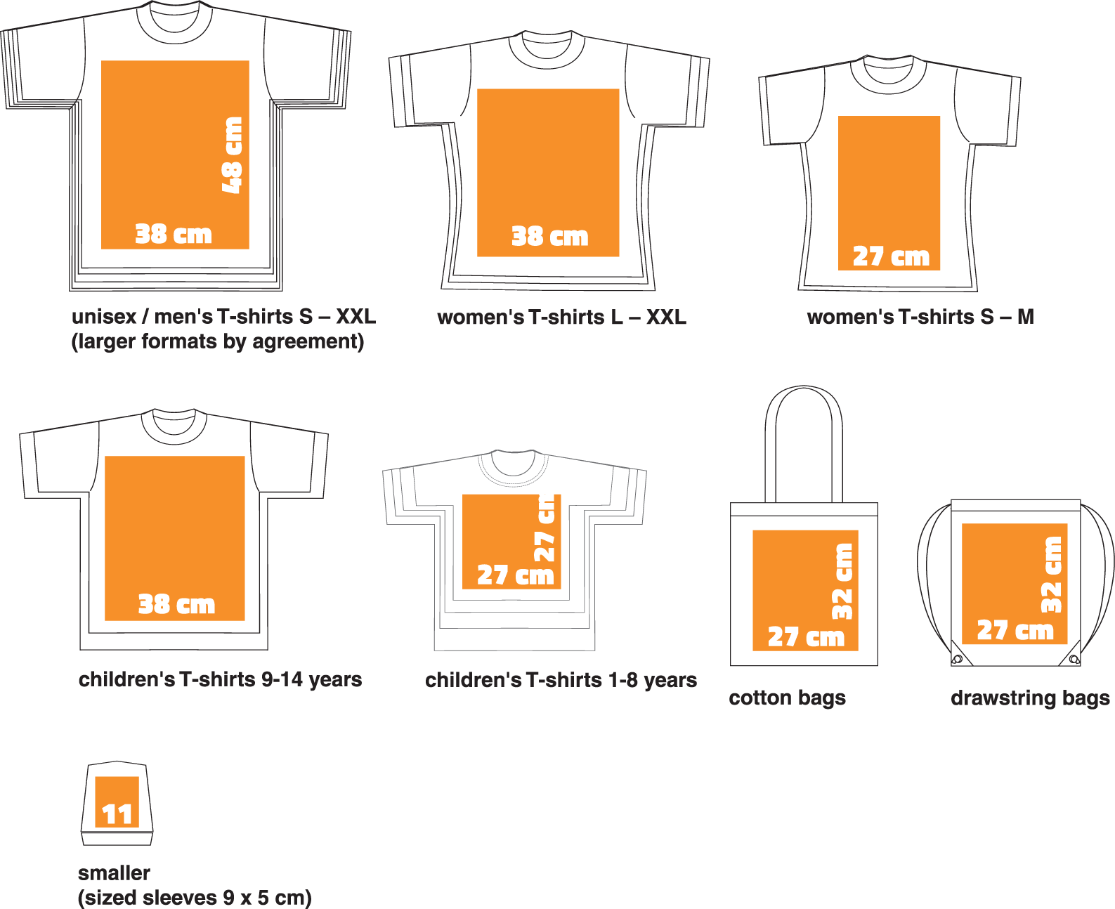 The maximum print size is determined by the size of the smallest T-shirt. If you want to print women’s and men’s T-shirts together in full format, the print size is limited by the size of the smallest T-shirt (women’s sizes S and M). The solution is to divide the design into two sizes, in which case the print price is calculated as two separate orders.